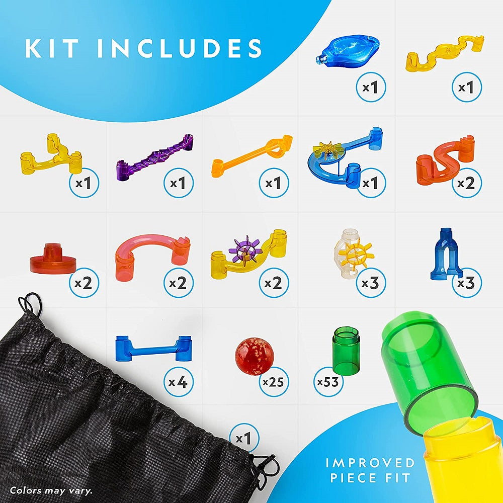 This Kit Includes: 25 glow-in-the-dark marbles; 1 UV light to help your marbles glow brighter, longer; 53 smooth-run tube pieces; 31 action pieces that fit securely together, so you can be sure that your marble run maze won’t fall apart when you play; 5 sturdy bases to build a stable structure; storage bag; and Learning Guide with instructions.