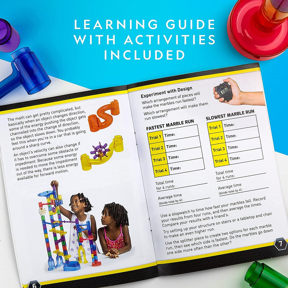 Configure the pieces in any design you’d like - the possibilities are endless! The detailed learning guide has lots of information about the physics of motion and gravity, so kids can learn while they play! And when they’re all done, a convenient storage bag is included so you can keep all the marble run pieces stored together.